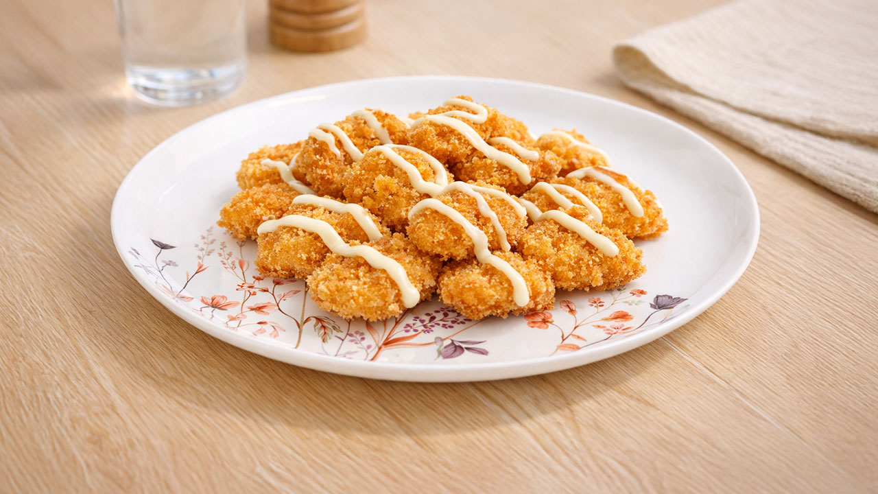 - Panaskan minyak, goreng nugget sampai keemasan dan benar‑benar crispy, tiriskan di atas tisu agar tidak terlalu berminyak.
